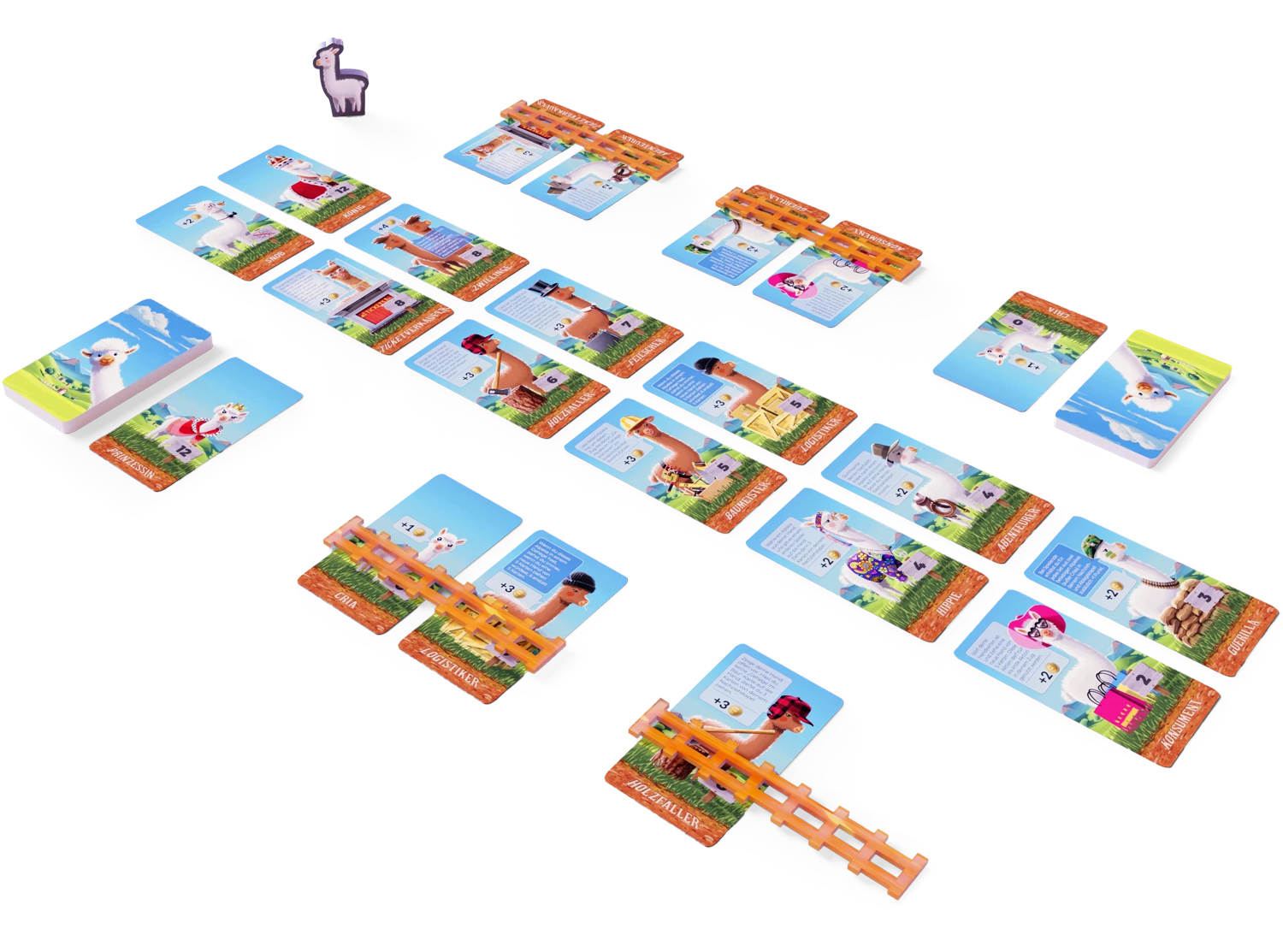 „Alpaka“ ist ein sogenanntes Deckbau-Spiel, bei dem ihr eure persönliche Kartenhand im Laufe des Spiels verbessert. Zu Beginn besitzt ihr nur einfache Karten, mit denen ihr Münzen erwirtschaften oder Gehege bauen könnt. In jeder Runde zieht ihr eine Hand von Karten und habt dann die Wahl, die Fähigkeiten eurer Alpakas zu nutzen, um Aktionen auszuführen, neue Alpakas vom zentralen Markt zu erwerben oder zusätzliche Gehege zu errichten. Die Reihenfolge dieser Aktionen ist frei wählbar und erlaubt euch damit, unterschiedliche Strategien auszuprobieren. Kaufen funktioniert über ein Einkommen, das ihr aus eurer Hand generiert, und neue Alpakas kommen auf euren Ablagestapel, um später wieder gezogen zu werden. Gehege sind wichtig, denn nur hinter einem solchen Zaun können eure Alpakas am Ende Punkte bringen. Jedes Gehege nimmt in der Regel zwei Tiere auf, und das Spiel endet, sobald jemand vier Gehege errichtet und vollständig befüllt hat. Dann wird verglichen, wer die wertvollste Sammlung hat. Die Mechanik ist insgesamt einfach, aber durch die Vielfalt der Alpaka-Fähigkeiten dynamisch und manchmal auch überraschend chaotisch.