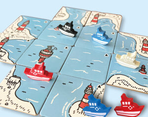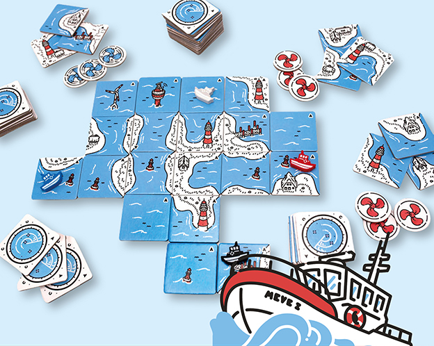 Am Anfang liegt lediglich das Hauptquartier bereit, von dem aus ihr eure Schiffe in die unbekannten Gewässer steuert. Jede:r hält einige Plättchen auf der Hand und verfügt über eine begrenzte Anzahl an Bewegungsschritten. In eurem Zug trefft ihr drei Entscheidungen und kombiniert das Legen von Plättchen, das Bewegen des eigenen Schiffes oder das Tauschen der eigenen Auslage. Wenn ihr ein Plättchen anlegt, muss es an das Feld grenzen, auf dem euer Schiff steht. Danach fährt euer Schiff automatisch auf das neue Plättchen. Auf diese Weise wächst die Seekarte nach und nach zu einer verzweigten Landschaft aus Inseln, Kanälen und Orientierungspunkten. Das Zusammenspiel entsteht durch Absprachen und durchdachte Routen, denn nur vollständig umschlossene Gebiete bringen Punkte. Die enthaltene Erweiterung mit Spezialschiffen wie Lotse, Forschungsschiff oder U Boot eröffnet neue Möglichkeiten und verleiht jeder Partie zusätzliche Ideen und Abwechslung.