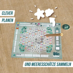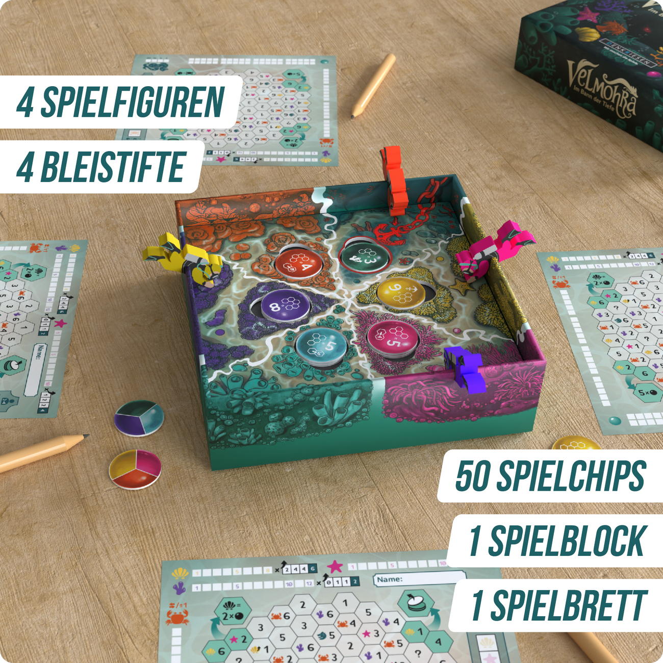 In „Velmohra“ steuert ihr jeweils eine Taucherfigur und zeichnet gleichzeitig auf einem persönlichen Tauchplan euren Tauchgang Runde für Runde auf. Ausgangspunkt ist das Zentrum eures Plans, von wo aus ihr Wege in Richtung Schätze und Perlen zieht. Dabei verbinden bestimmte Muster im Raster des Blocks Bereiche, die sich für das Einsammeln von Perlen eignen. Sobald ihr eine Form richtig eingezeichnet habt, markiert ihr sie als genutzt und nehmt euch ein entsprechendes Perlenplättchen, das Punkte bringt. Parallel dazu bewegt ihr eure Figur auf dem Brett, sammelt dort Meeresschätze wie Seesterne oder Korallen ein und erlebt Begegnungen, die zusätzliche Effekte auslösen oder Bonuspunkte bringen können. Ein zentrales Moment ist der Wettlauf um die begrenzten Perlenplättchen: Nur die erste Person, die eine Form erfüllt, sichert sich den entsprechenden Schatz. Das erzeugt eine spürbare Dynamik am Tisch, denn ihr müsst sowohl eure eigenen Wege klug planen als auch darauf achten, was die anderen zeichnen und sammeln. Das Spiel endet, sobald bestimmte Bedingungen erfüllt sind, etwa wenn ein Vorrat an Perlenplättchen aufgebraucht ist oder eine bestimmte Anzahl besonderer Felder erkundet wurde. Am Ende gewinnt die Person mit den meisten Punkten aus Perlen, Schätzen und Begegnungen.